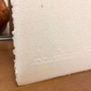 La grammatura della carta è 200 gr/mq ed è fatta a mano in 100% cotone.
