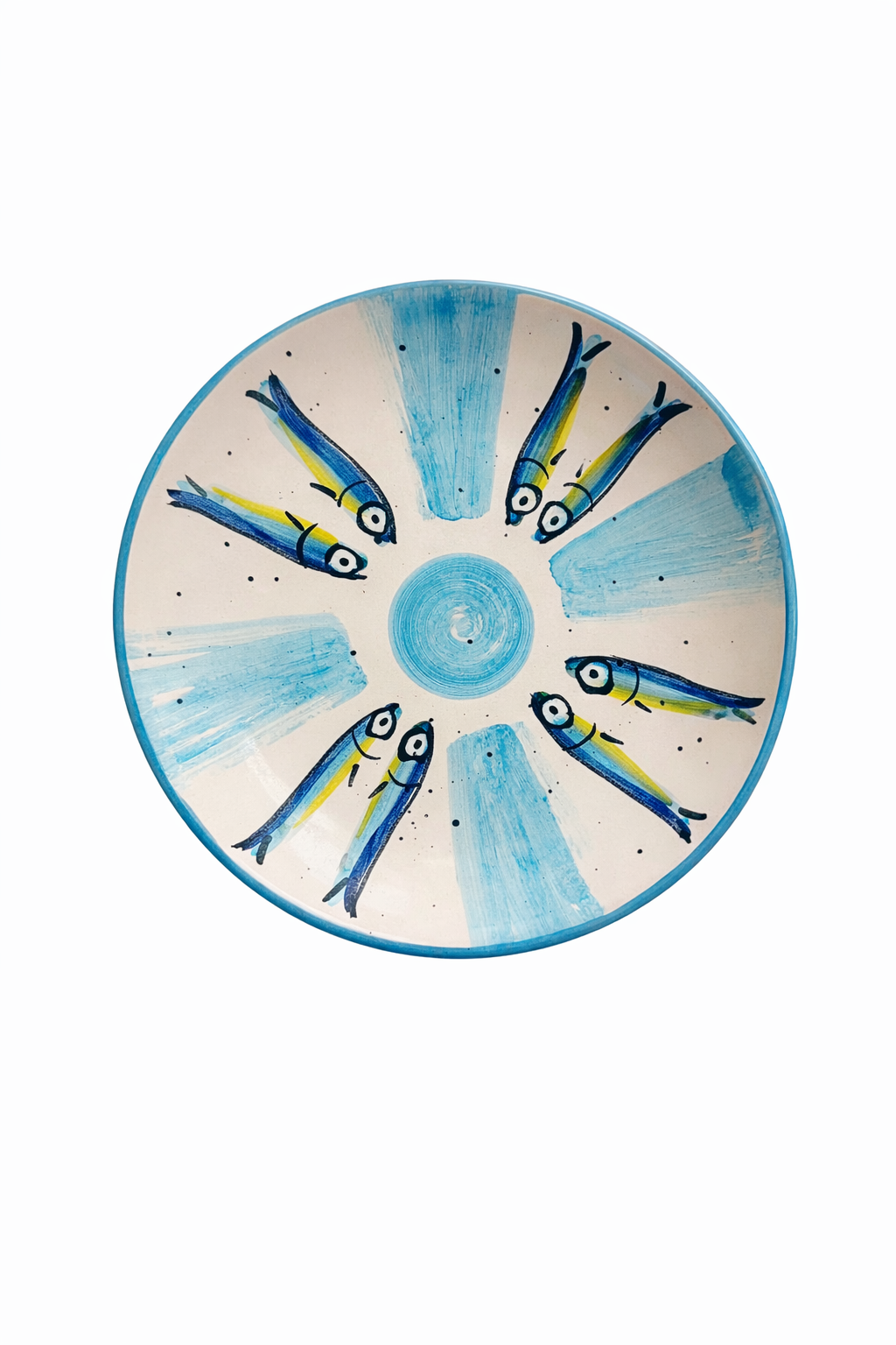 Un richiamo al mare della Costiera: le alici disposte a raggiera e le pennellate azzurre creano un effetto luminoso e artigianale, diverso in ogni pezzo. Dipinto a mano da Nicki in esclusiva per TABULA, con marchio sul retro e predisposizione per essere appeso.