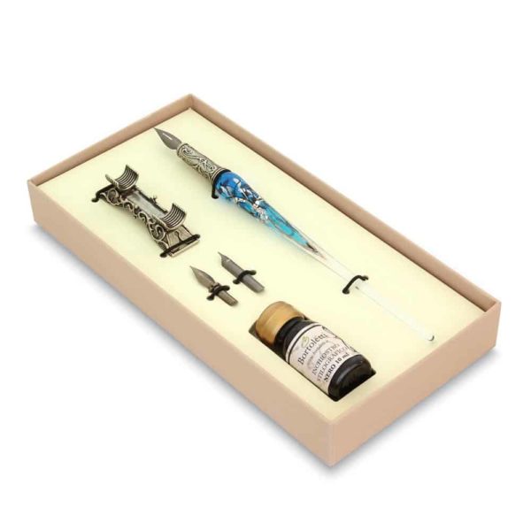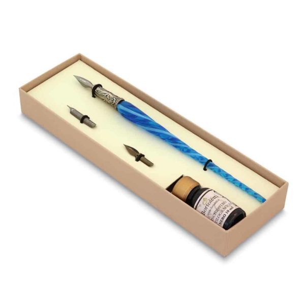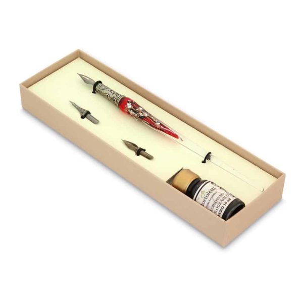 Set completo da calligrafia composto da penna calligrafica in vetro di murano, pennino in vetro di cristallo e boccetta con inchiostro stilografico, con questo set potrai dedicarti nell’arte della calligrafia antica. La raffinatezza dell’argento lavorato a lume insieme allo squisito stile veneziano creano una penna calligrafica in vetro di murano con punta in vetro di cristallo unica. Può essere abbinata perfettamente anche con la nostra famosa carta di Amalfi fatta a mano. Ideale regalo di laurea per uomo o donna.